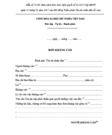 Hiện nay, mẫu Đơn kháng cáo vụ án dân sự được ban hành kèm theo Nghị quyết số 01/2017/NQ-HĐTP.